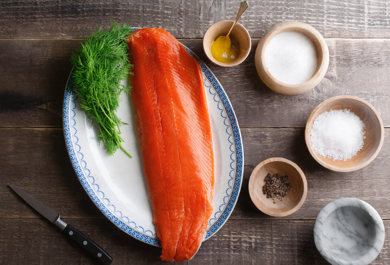 La salatura è un passaggio cruciale, perché aiuta a rimuovere l’umidità dal salmone e ne migliora la conservazione. Il processo di “dry brining” consiste nel creare una miscela secca di sale e zucchero per ricoprire il pesce.